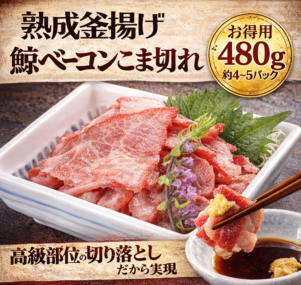 鯨の高級部位を使用した熟成釜揚げベーコンのこま切れを、お得な大容量セットでご用意しました。